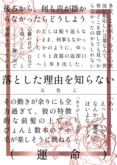 食後、わたしはコップに残った紅茶を飲み干すと、徐に立ち上がった。そして、スカートのポケットから取り出した薔薇の刺繍のハンカチを、何でもないことのように、持った指ごと机の端にそっと引っ掛けるようにして――"うっかり"落とした。