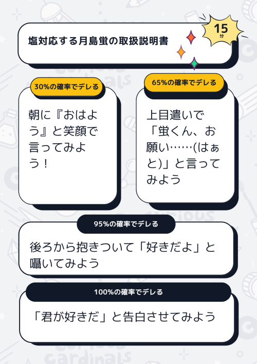 「……。祠に塩がたくさん供えられていて、取扱説明書には、蛍くんをデレさせる方法が書いてあったの。上目遣いでお願いすると、65%の確率でデレるって」