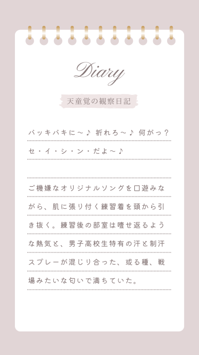 ご機嫌なオリジナルソングを口遊みながら、肌に張り付く練習着を頭から引き抜く。練習後の部室は噎せ返るような熱気と、男子高校生特有の汗と制汗スプレーが混じり合う、或る種、戦場みたいな匂いで満ちていた。俺、天童覚にとっては、楽園の芳香みたいなもんだけどね。